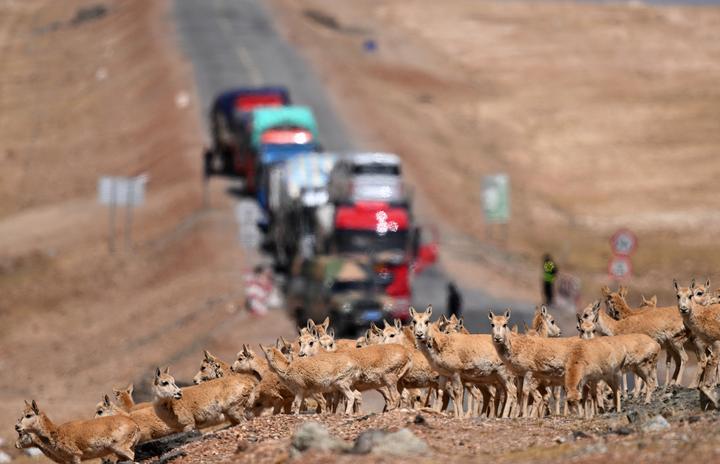 5月29日,在青??煽晌骼铮蝗捍菩源a(chǎn)藏羚羊通過青藏公路。新華社記者 張宏祥 攝