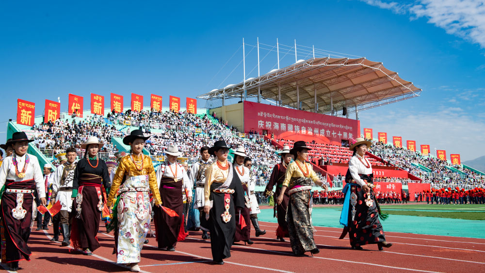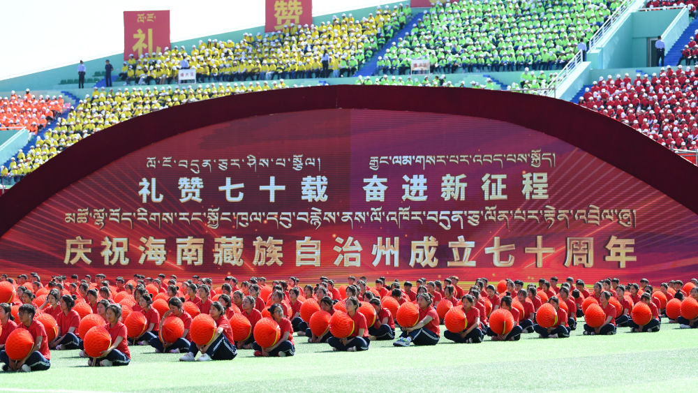 8月1日,青海省海南藏族自治州舉行慶祝成立70周年大會(huì)。海南州民族體育場(chǎng)彩旗飄飄,歌聲悠揚(yáng),各族群眾身著盛裝,滿懷喜悅。