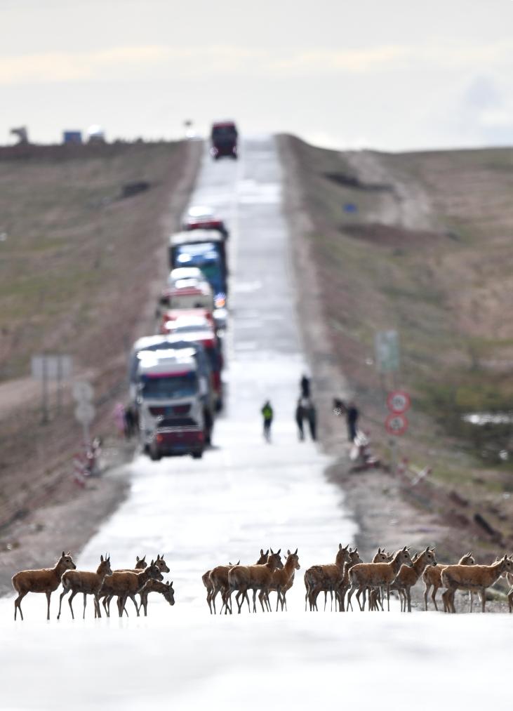7月28日,一群藏羚羊通過(guò)青藏公路前往三江源地區(qū)的棲息地。新華社記者 張宏祥 攝