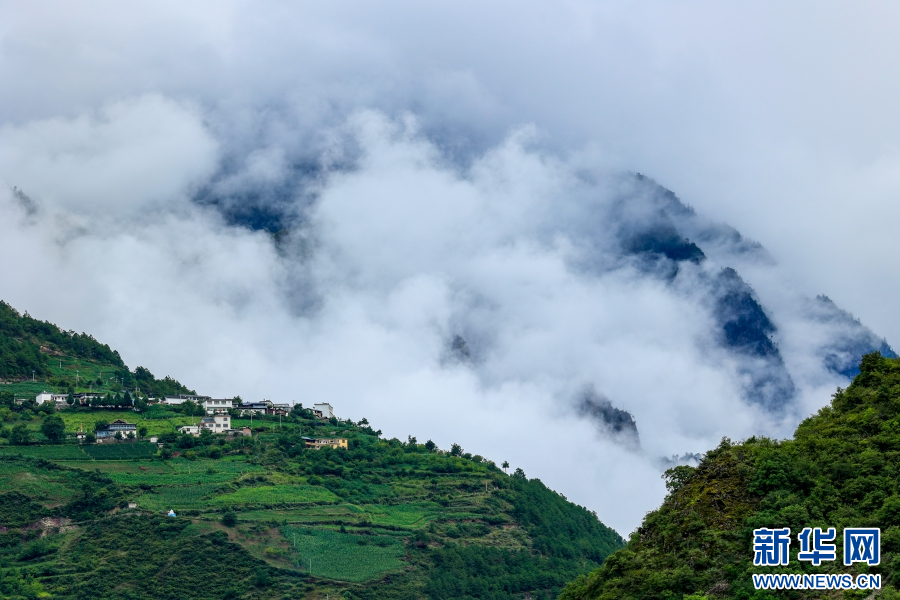 村莊與云霧繚繞的群山相映成景(7月29日攝)。新華網(wǎng) 趙普凡 攝