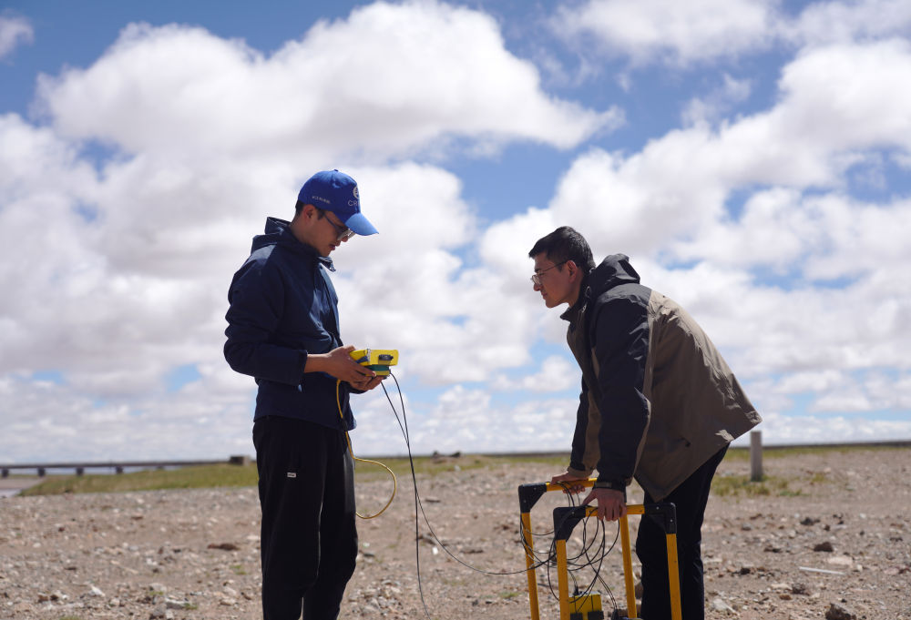 科考隊(duì)員董士琦(左)和范越在長(zhǎng)江北源楚瑪爾河附近進(jìn)行地質(zhì)雷達(dá)探測(cè)(7月29日攝)。新華社記者 陳杰 攝