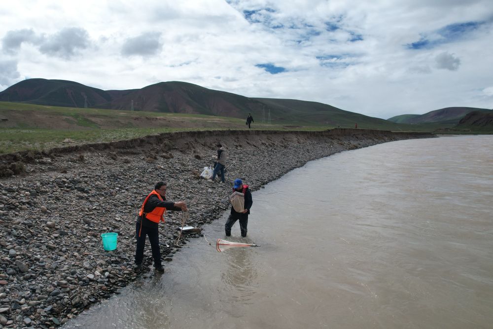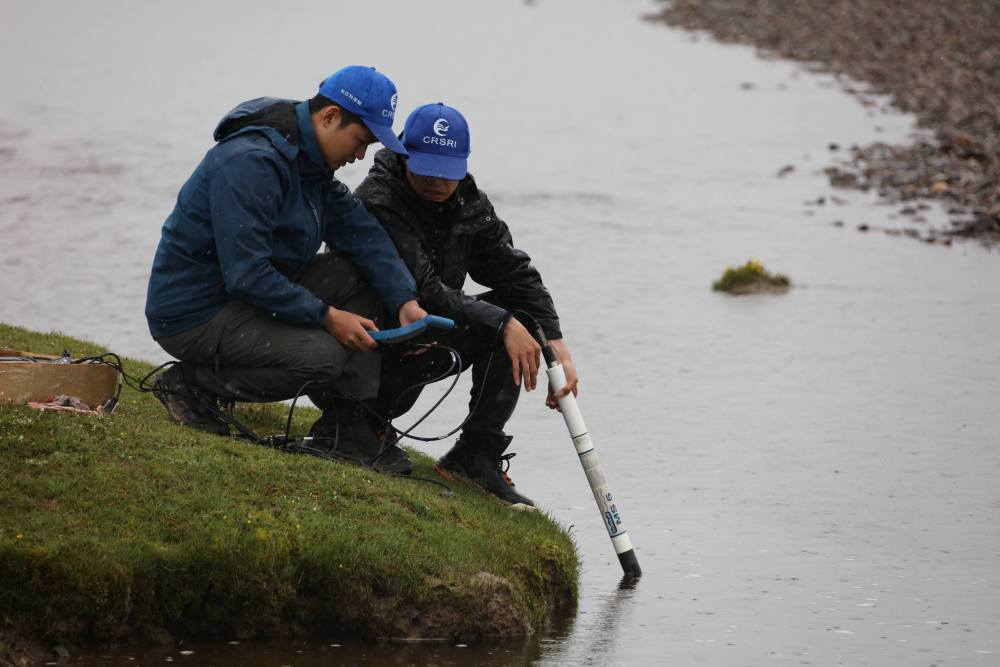 來(lái)自長(zhǎng)江科學(xué)院河流研究所的科考隊(duì)員徐志成和楊緒海,每到一個(gè)采樣點(diǎn)就采集河道床沙和懸沙樣品,測(cè)量河寬、水深、比降、流速,對(duì)比此前科考觀測(cè)數(shù)據(jù),分析長(zhǎng)江源區(qū)河道水沙輸移特性和河床演變情況。