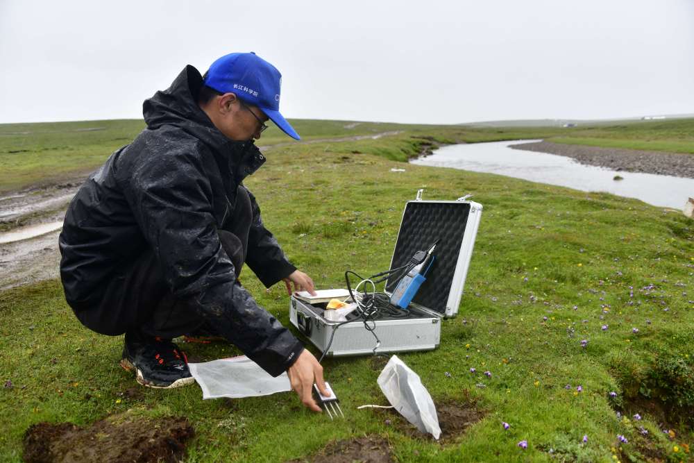在查旦濕地,來(lái)自長(zhǎng)江科學(xué)院空間信息技術(shù)應(yīng)用研究所的科考隊(duì)員張雙印和隊(duì)友合作,用繩子圈出一個(gè)1平方米的正方形草地樣方,采集樣方內(nèi)的植被樣品;將圓柱形環(huán)刀釘入地下,采集土壤樣品。這些植被、土壤樣品將被送回實(shí)驗(yàn)室,統(tǒng)一分析碳含量。
