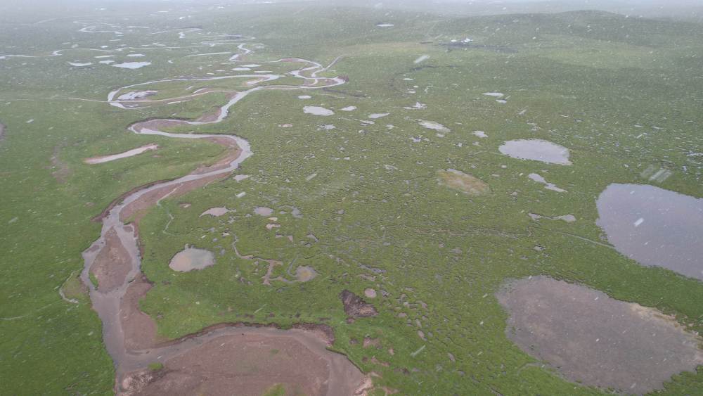 風(fēng)雪彌漫中的當(dāng)曲濕地(7月24日攝,無(wú)人機(jī)照片)。新華社記者 劉詩(shī)平 攝