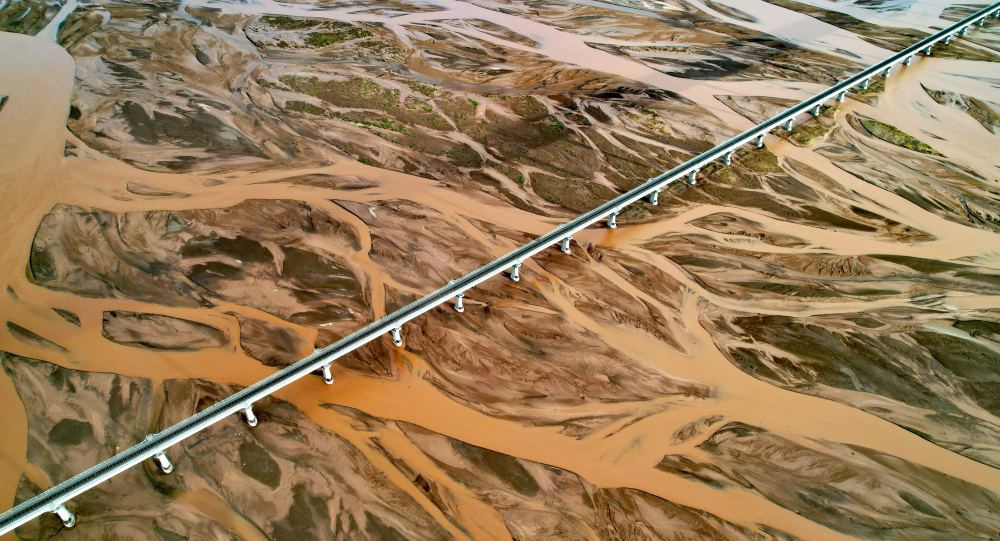 青藏鐵路列車通過(guò)辮狀河道的長(zhǎng)江北源楚瑪爾河(7月29日攝,無(wú)人機(jī)照片)。新華社記者 劉詩(shī)平 攝