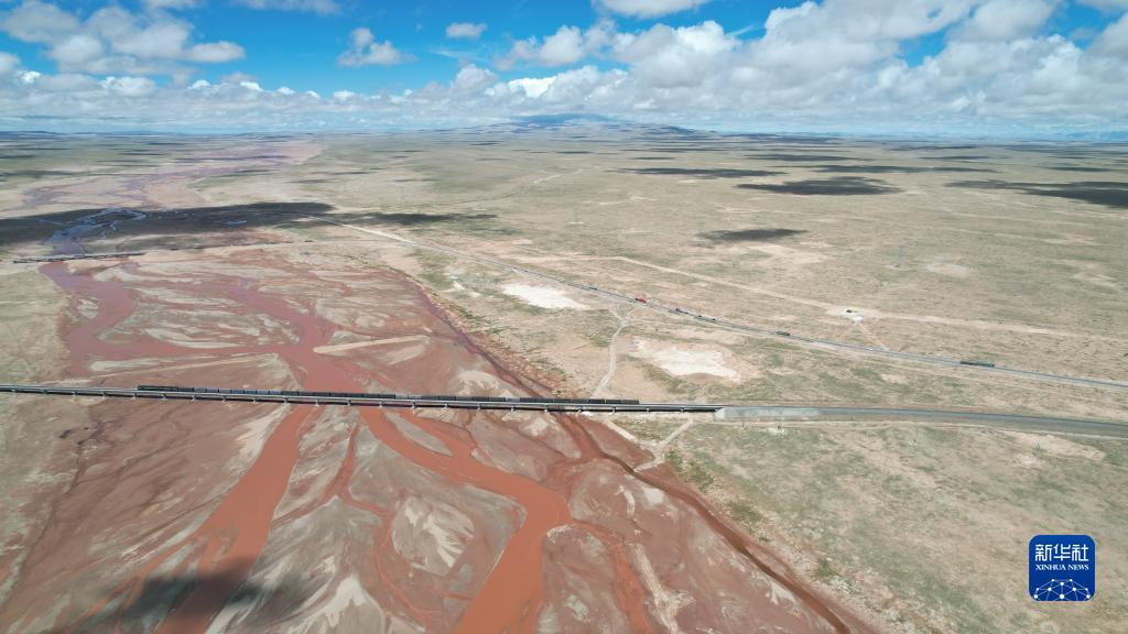青藏鐵路列車通過(guò)楚瑪爾河(7月29日攝,無(wú)人機(jī)照片)。 新華社記者 劉詩(shī)平 攝