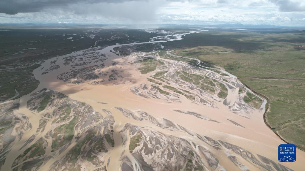 沱沱河與當(dāng)曲匯合處的囊極巴隴,辮狀河道寬度超過(guò)3千米(7月26日攝,無(wú)人機(jī)照片)。 新華社記者 劉詩(shī)平 攝