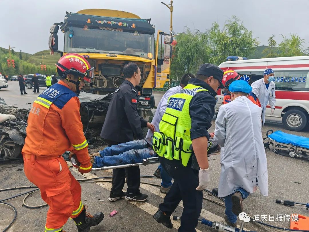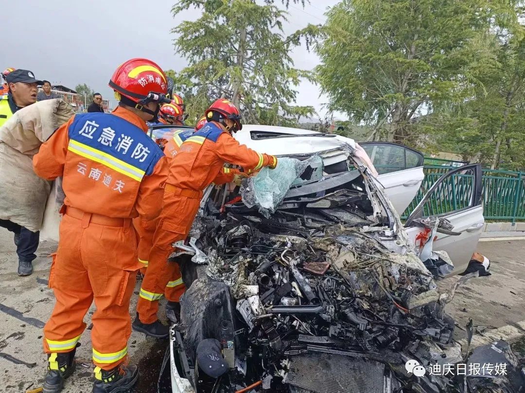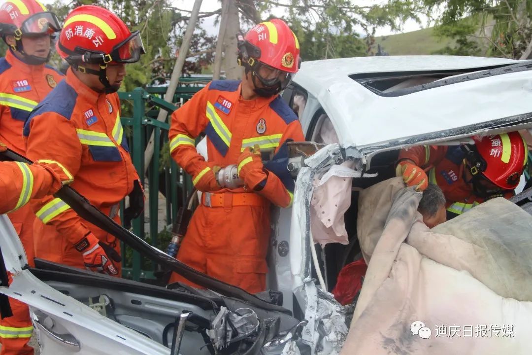 接到調令后,香格里拉消防救援站立即出動2車13人前往處置,到達現場后,發(fā)現一輛小轎車與一輛貨車相撞,轎車嚴重受損變形,車內安全氣囊已彈出,副駕駛位被困人員頭部、腿部多處受傷無法動彈,意識模糊,有嚴重生命危險。