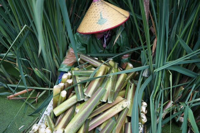 走到田間,只見十余名務工人員腳穿水鞋,頭頂斗笠,手拿彎刀向下一揮,再去頭割尾,一顆光潔的茭白便采割完成了。采割好的茭白在岸邊經過簡單清洗后,便運往冷庫包裝,銷往各地。