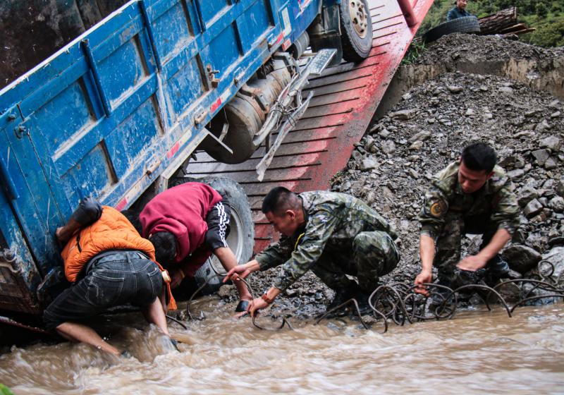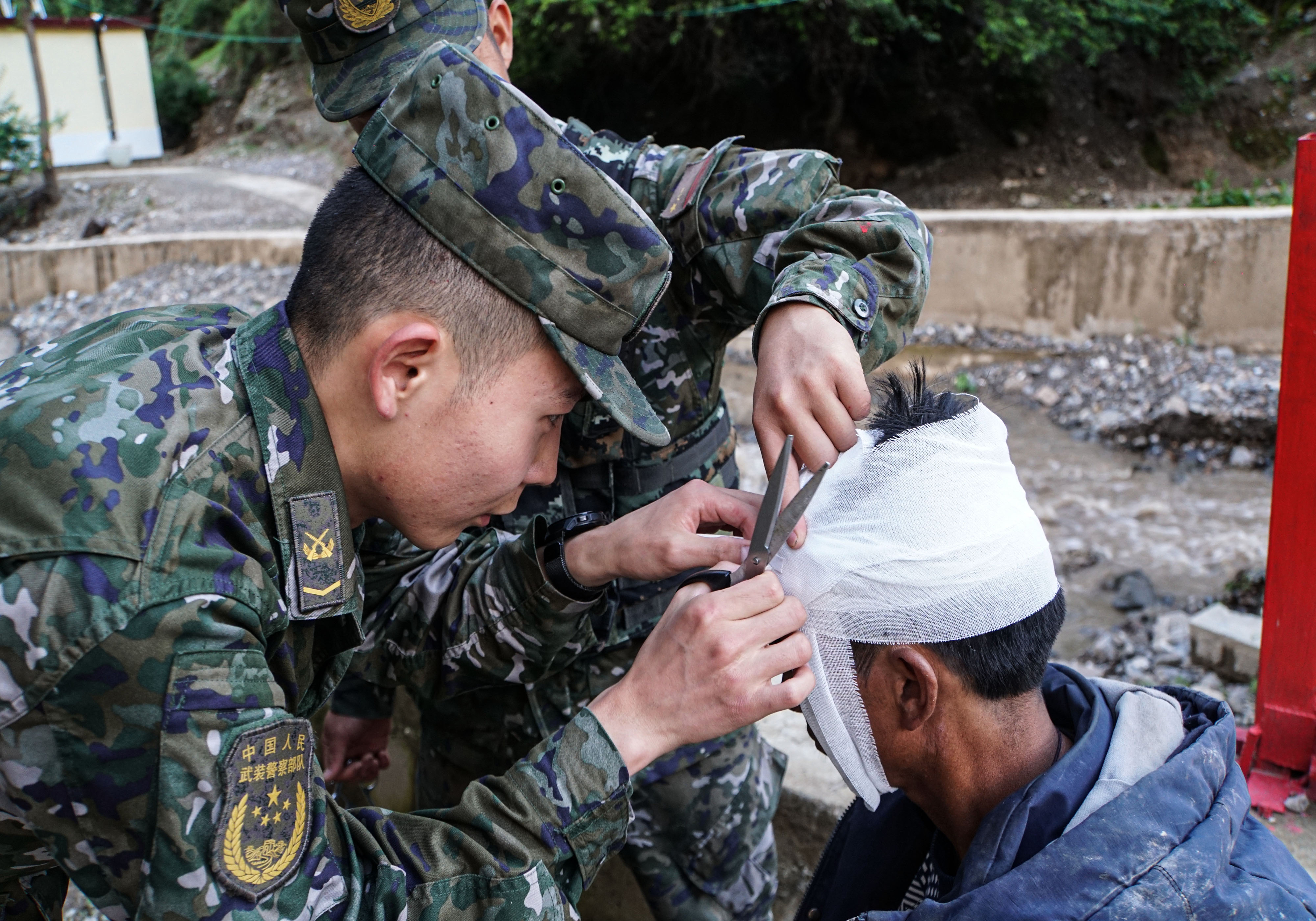 “同志,不要怕,我們是武警官兵,我們先給你處理傷口?!?甕云飛一邊安撫受傷群眾的情緒,一邊為他消毒止血、包扎傷口。后經檢查,該群眾除了頭部有輕微皮外傷外,全身并無大礙。之后,中隊官兵又和當地群眾一起投入車輛緊急救援,經過幾個小時的努力,大家齊心協(xié)力將貨車拖至安全地帶。