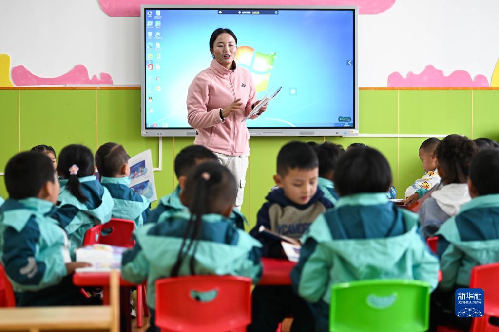 9月4日,青海省果洛藏族自治州阿尼瑪卿幼兒園老師給孩子們上課。新華社記者 張龍 攝