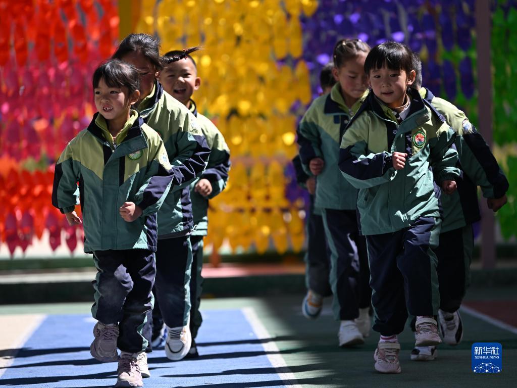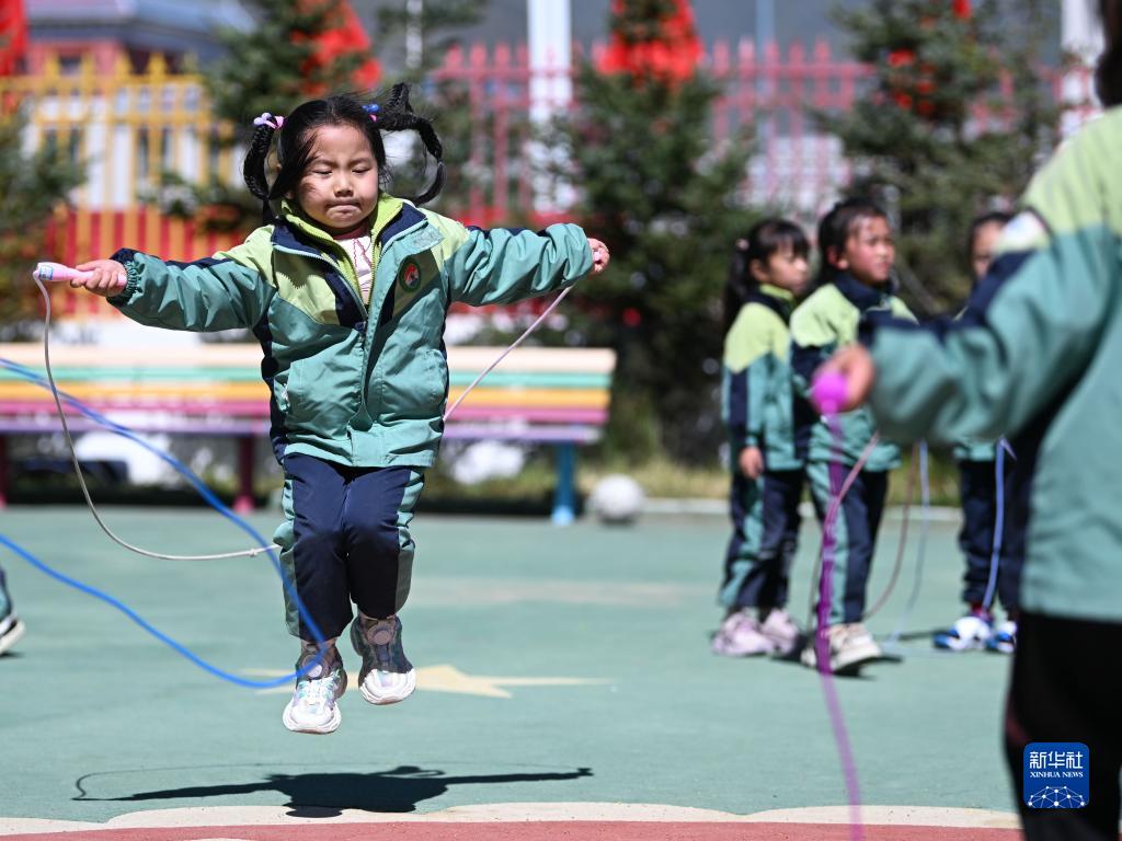 9月4日,青海省果洛藏族自治州瑪沁縣大武幼兒園小朋友在跳繩。新華社記者 張龍 攝