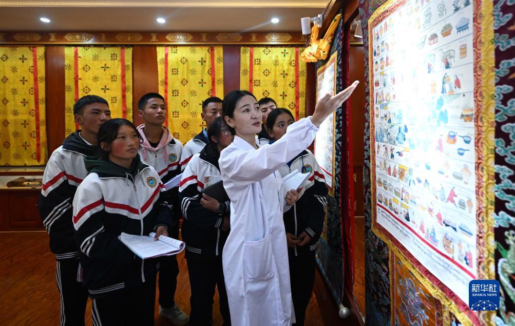 9月8日,在果洛藏族自治州職業(yè)技術學校,藏醫(yī)醫(yī)療與藏藥專業(yè)學生跟隨授課老師觀看藏醫(yī)典籍唐卡。新華社記者 張龍 攝