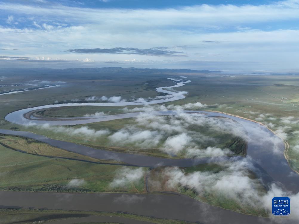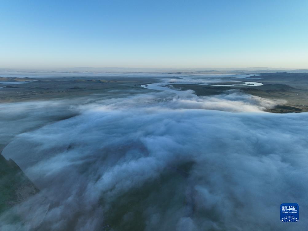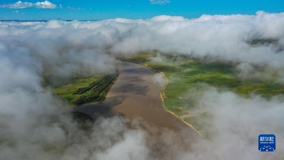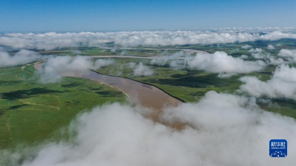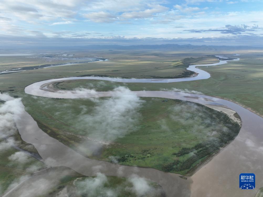 這是8月22日清晨在四川省阿壩藏族羌族自治州若爾蓋縣唐克鎮(zhèn)拍攝的黃河九曲第一灣景色(無(wú)人機(jī)照片)。新華社記者 邢廣利 攝