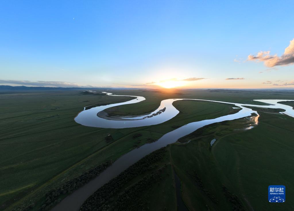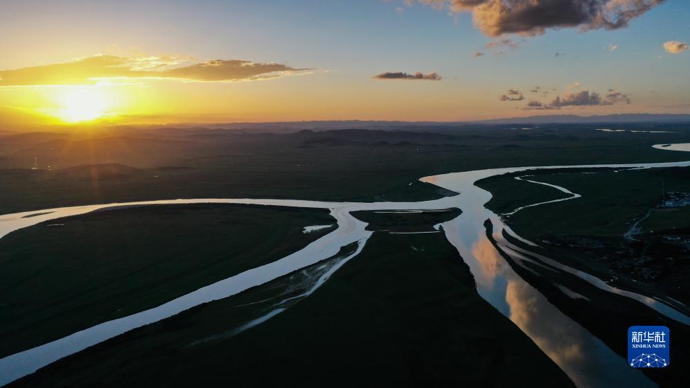 這是8月21日在四川省阿壩藏族羌族自治州若爾蓋縣唐克鎮(zhèn)拍攝的黃河九曲第一灣落日(無(wú)人機(jī)照片)。新華社記者 王曦 攝
