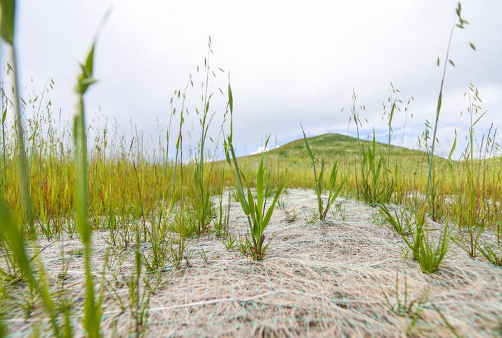 在若爾蓋縣唐克鎮(zhèn)嘎爾瑪村,這里的草原生態(tài)修復(fù)項(xiàng)目已完成近三個(gè)月。目之所及,蓋上“椰絲毯”的坡面,與遼闊的若爾蓋大草原融為一體。披堿草、老芒麥、高冰草和黑麥草從“椰絲毯”織成的小方格中破土而出,最高已近半米。