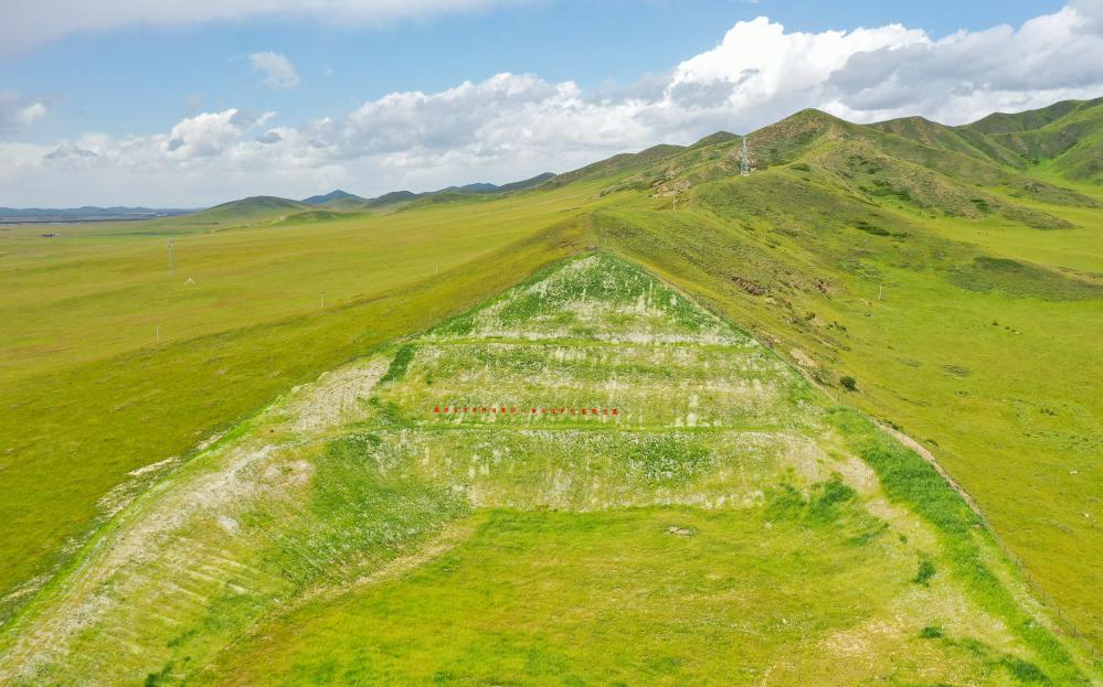 這是在四川省阿壩藏族羌族自治州若爾蓋縣達(dá)扎寺鎮(zhèn)多瑪村廢棄礦山治理點(diǎn)拍攝的“椰絲毯”。新華社記者 王曦 攝