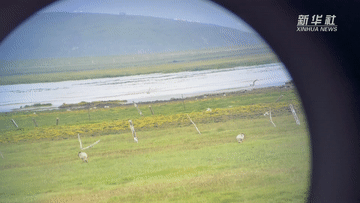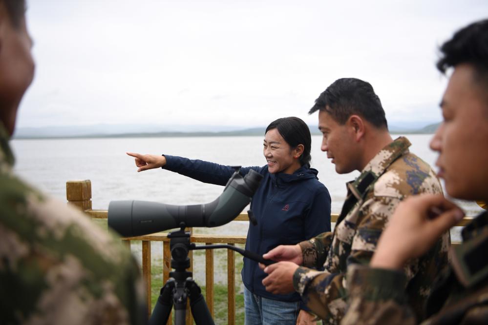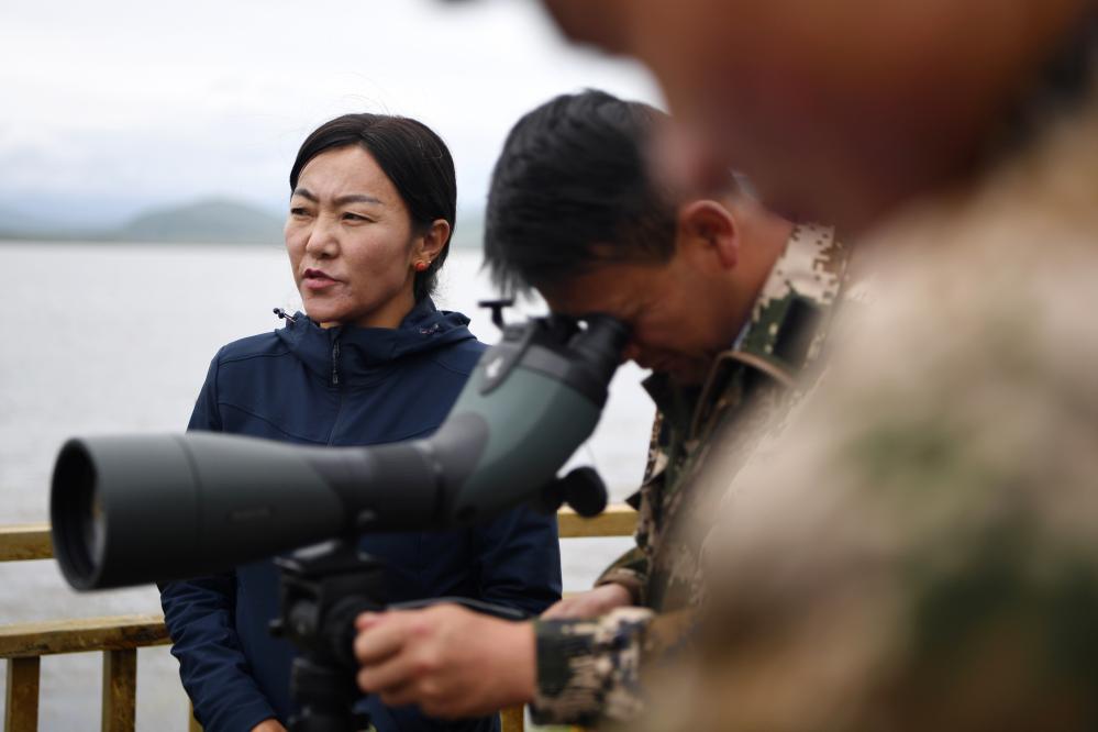 甘肅尕海則岔國家級(jí)自然保護(hù)區(qū)管護(hù)中心尕海保護(hù)站站長香毛吉(左一)和同事在保護(hù)區(qū)內(nèi)用望遠(yuǎn)鏡觀測(cè)野生動(dòng)物。 新華社記者 陳斌 攝
