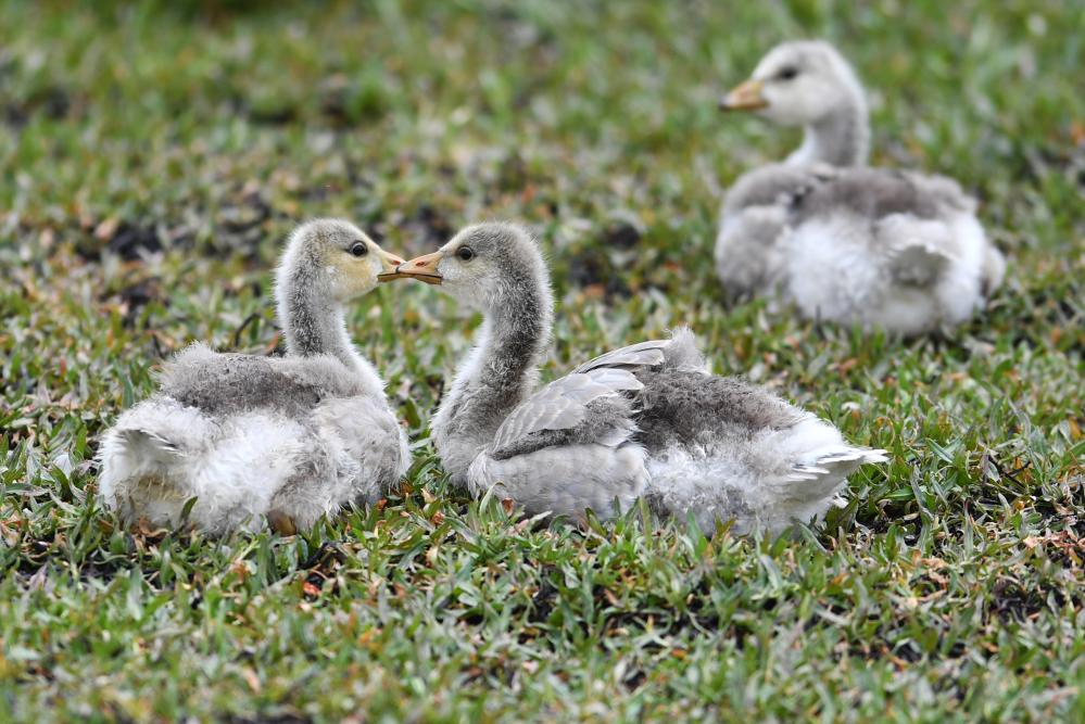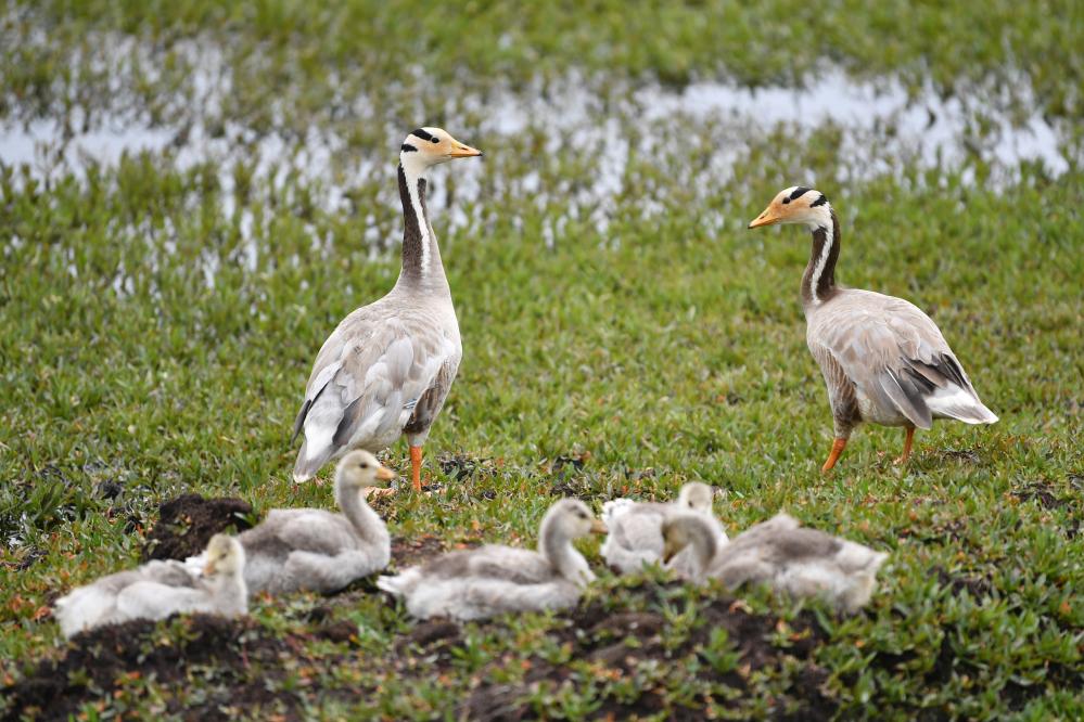 斑頭雁幼鳥在甘肅尕海則岔國家級(jí)自然保護(hù)區(qū)的尕海濕地嬉戲。 新華社記者 陳斌 攝