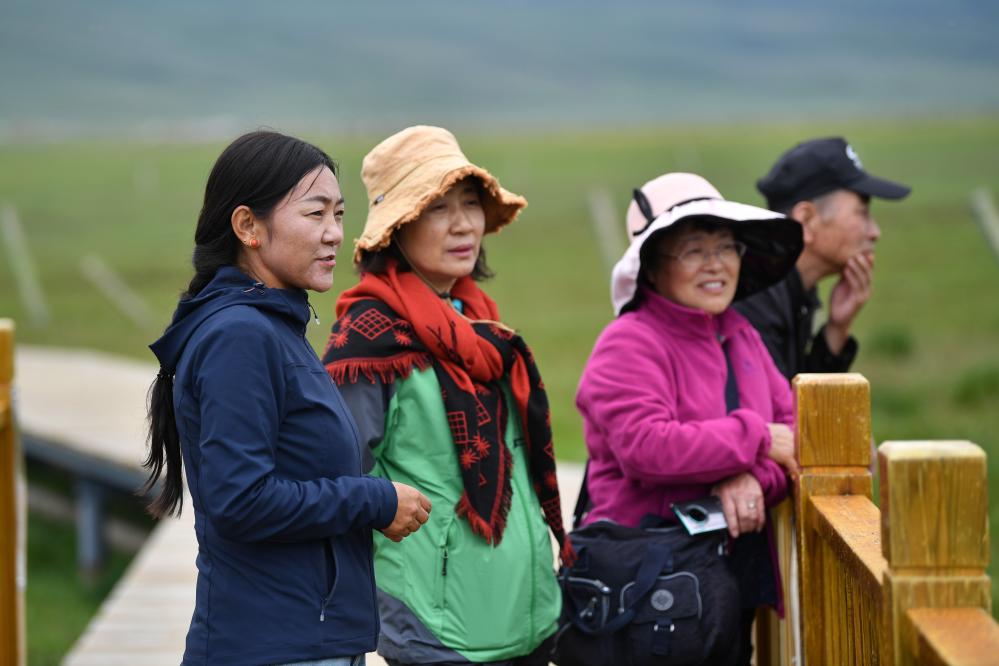 甘肅尕海則岔國家級(jí)自然保護(hù)區(qū)管護(hù)中心尕海保護(hù)站站長香毛吉(左一)向游客介紹保護(hù)區(qū)的野生動(dòng)植物情況。 新華社記者 陳斌 攝