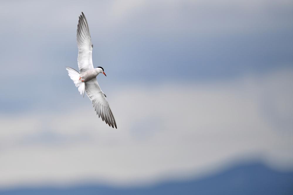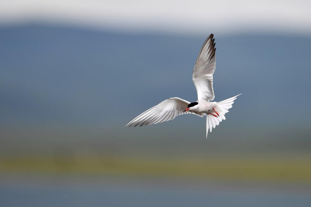 一只燕鷗在甘肅尕海則岔國家級(jí)自然保護(hù)區(qū)的尕海濕地上飛翔。 新華社記者 陳斌 攝