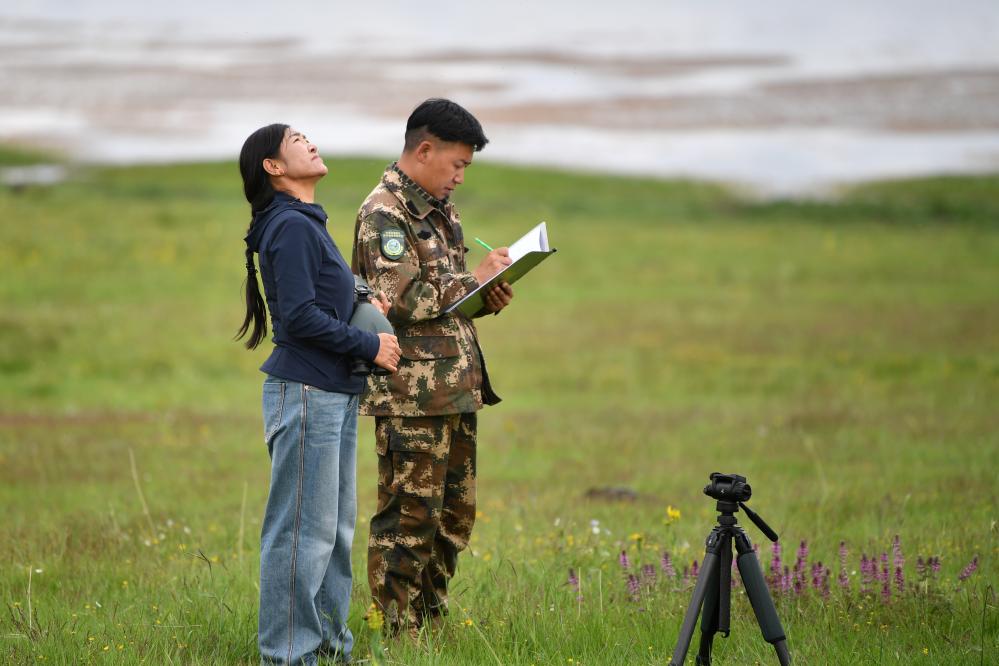 甘肅尕海則岔國家級(jí)自然保護(hù)區(qū)管護(hù)中心尕海保護(hù)站站長香毛吉(左)和同事在巡護(hù)過程中做記錄。 新華社記者 方欣 攝