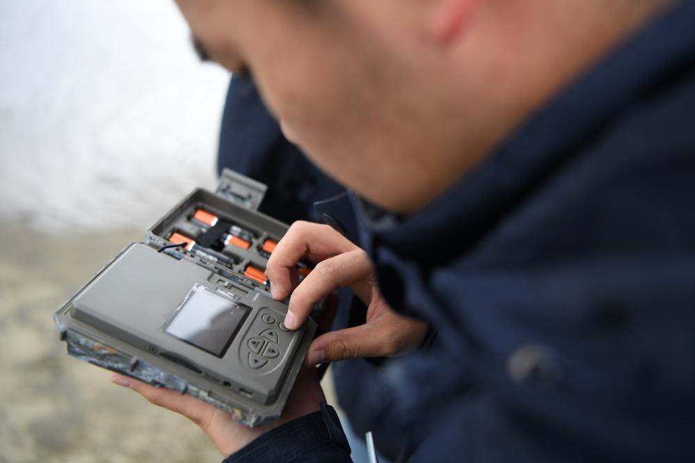 甘肅黃河首曲國家級(jí)自然保護(hù)區(qū)管護(hù)中心曼日瑪保護(hù)站的工作人員在保護(hù)區(qū)內(nèi)檢查紅外相機(jī)的工作情況。 新華社記者 方欣 攝