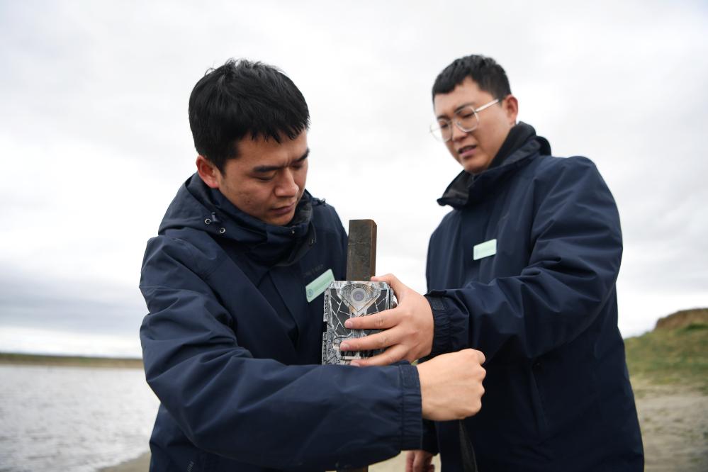 甘肅黃河首曲國家級(jí)自然保護(hù)區(qū)管護(hù)中心曼日瑪保護(hù)站工作人員王佳陽(右)和同事在保護(hù)區(qū)內(nèi)安放紅外相機(jī)。 新華社記者 張可任 攝