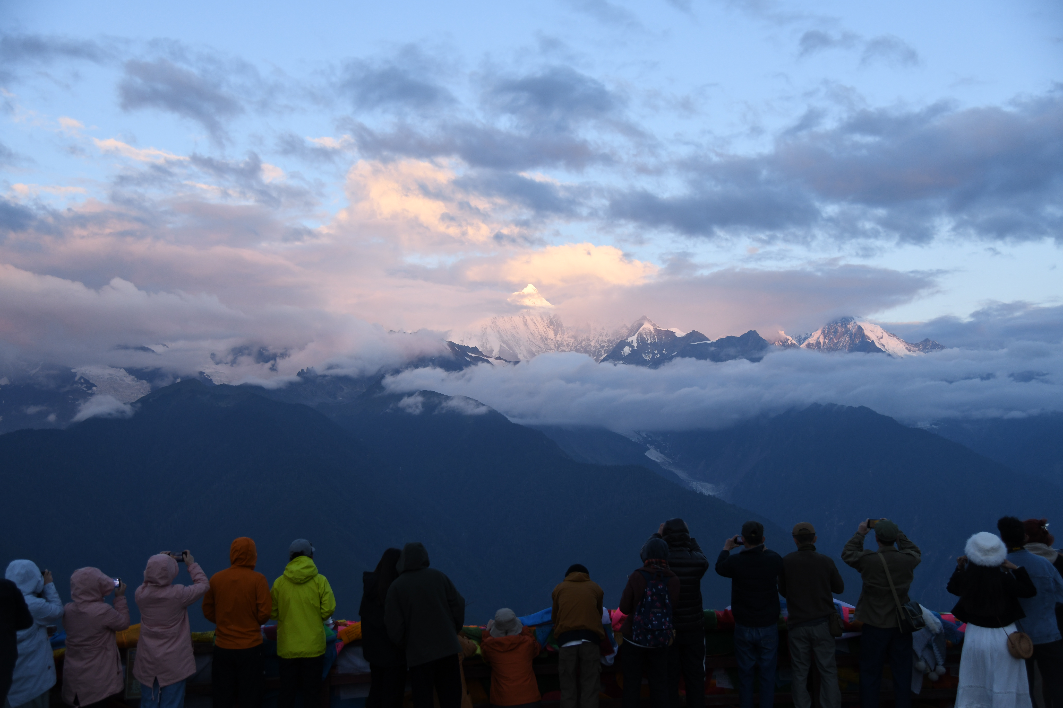 入秋以來,秋風撩開縈繞在梅里雪山周圍的云霧,也迎來了觀賞“日照金山”的最佳時節(jié)。每天清晨6點左右,大批游客就開始蹲守,只為一睹梅里雪山“日照金山”的奇觀。圖為游客觀賞并記錄“日照金山”奇觀。