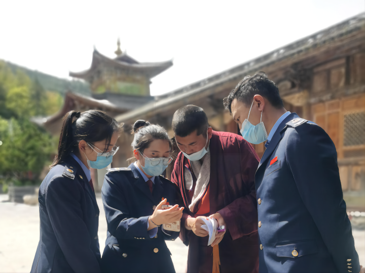 圖為縣稅務(wù)局“傈鄉(xiāng)稅宣小分隊”上門為壽國寺的藏傳佛教僧眾開展城鄉(xiāng)“兩險”手機(jī)繳納流程輔導(dǎo)和民族團(tuán)結(jié)進(jìn)步相關(guān)知識宣傳。