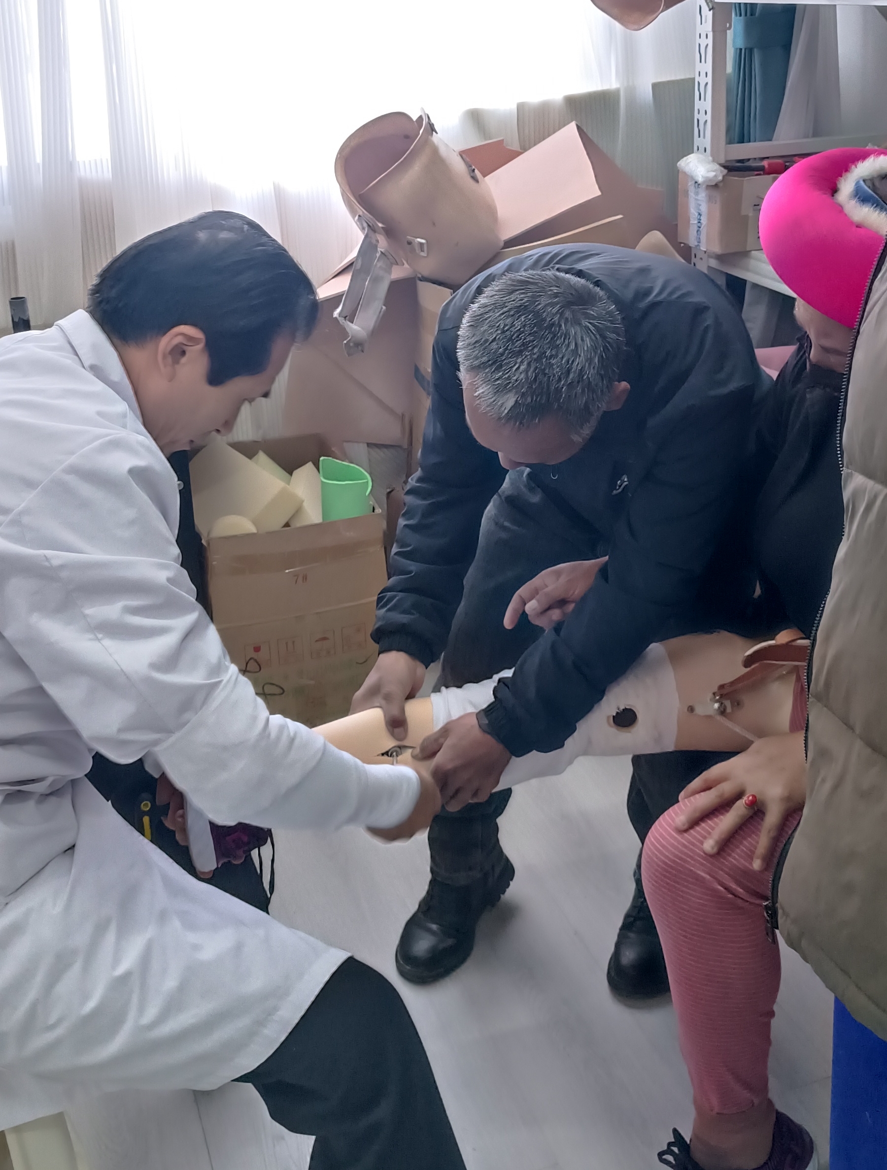 近日,在州康復中心,隨著30名肢體殘障群體的假肢適配成功,2023年省級殘疾人事業(yè)彩票公益金助聽器、假肢適配服務項目圓滿結束。據(jù)了解,該項目在今年還為我州300名聽力殘障群體免費適配助聽器。圖為醫(yī)生為肢體殘障人士適配假肢。