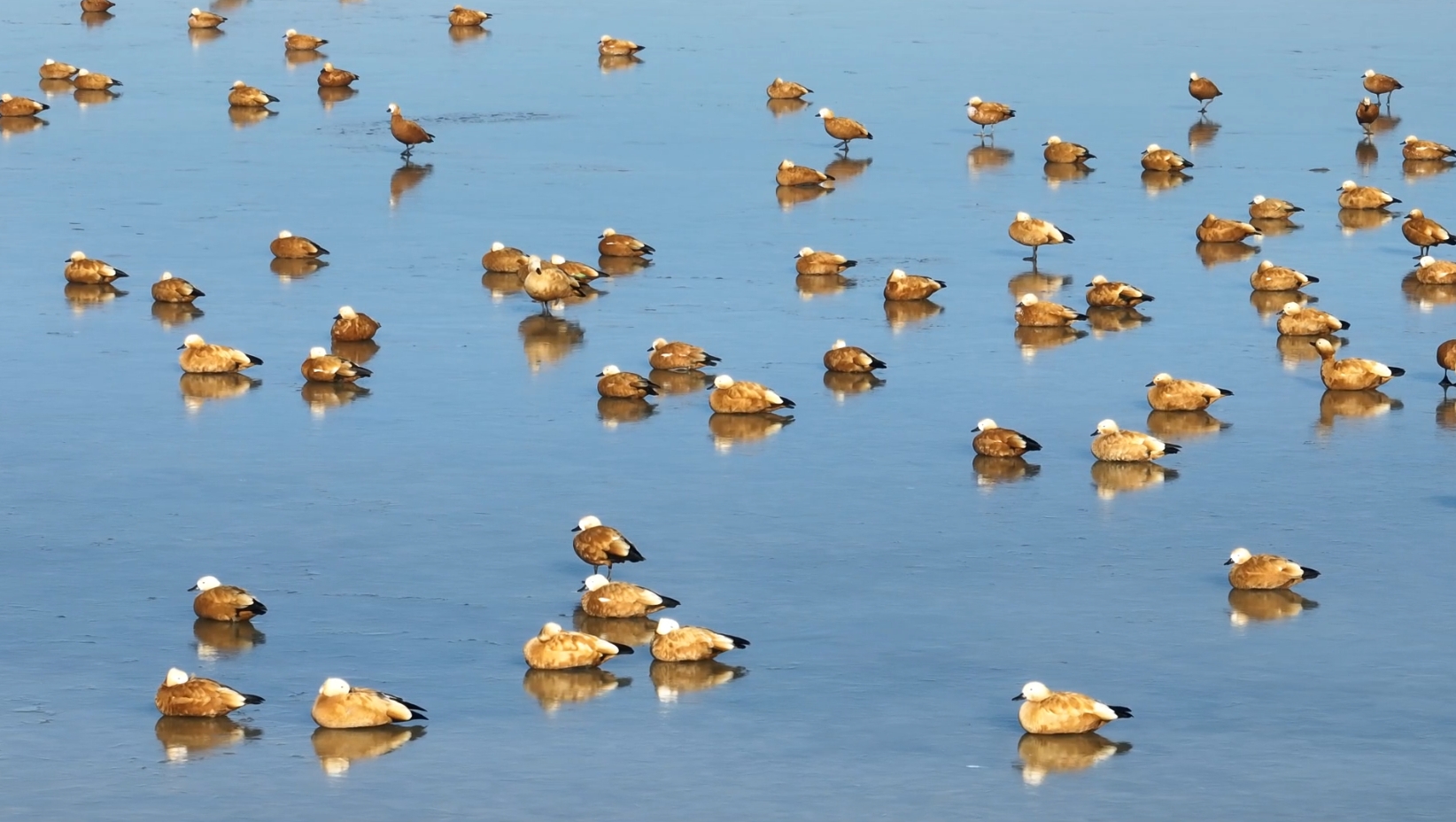 秋末冬初,昆侖山腳下的尕斯庫勒湖濕地迎來數(shù)千只赤麻鴨,它們在結(jié)了薄冰的湖面上或嬉戲,或休息,頗為愜意。