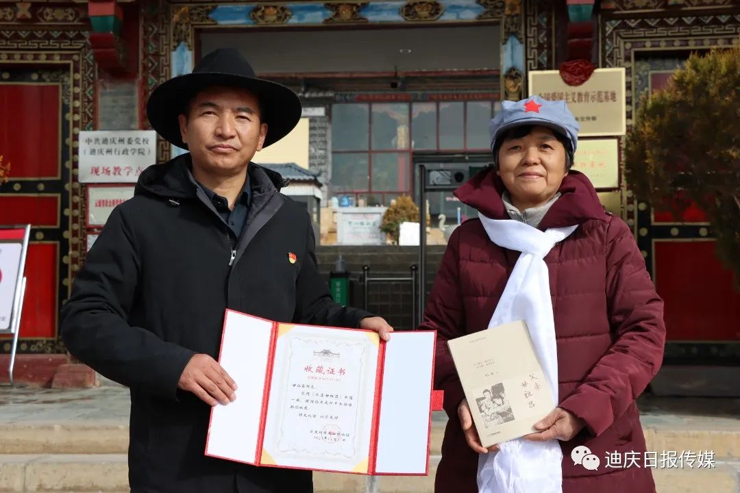 迪慶紅軍長征博物館館長潘高原代表博物館接收了這些珍貴的革命資料、實(shí)物,向他們授予了榮譽(yù)證書并在博物館前合影留念。