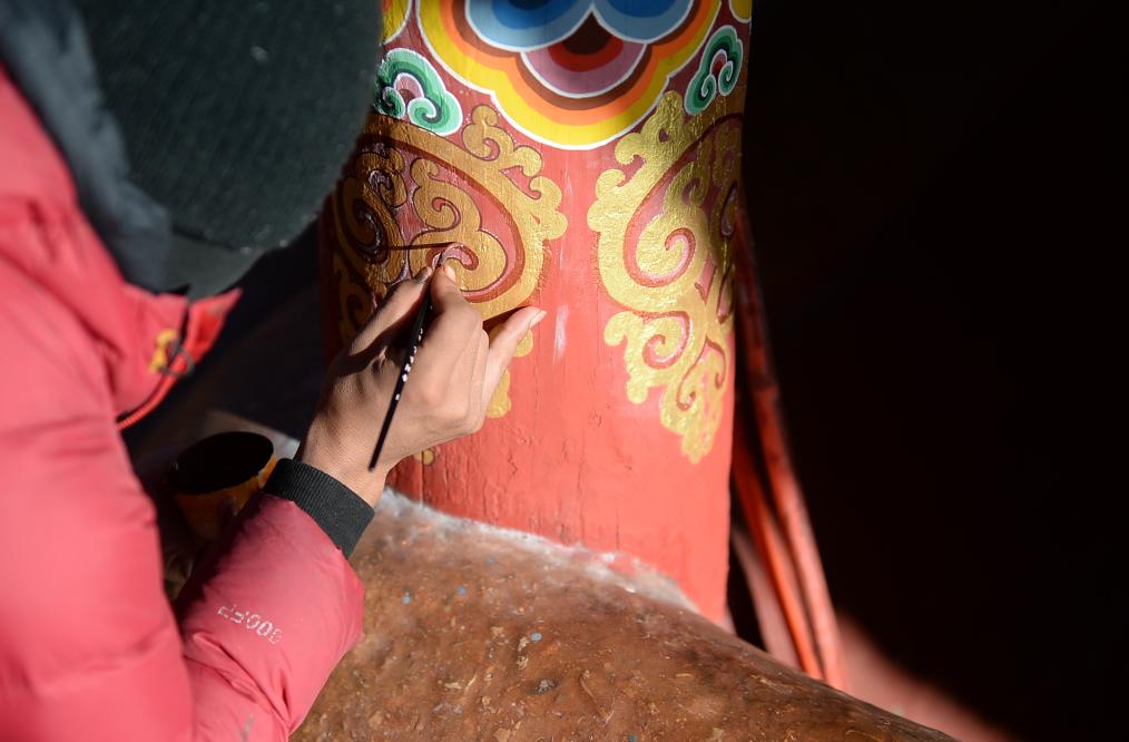 在德格印經(jīng)院,手工藝人在修補梁柱上的繪畫。新華社資料片