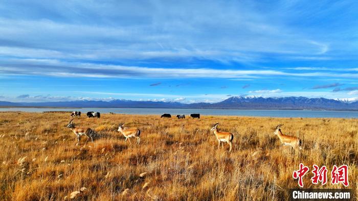 黑頸鶴、鵝喉羚多種野生動物“同框”現(xiàn)身青海都蘭湖國家濕地公園