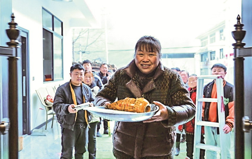 劉有榮端著碗筷進(jìn)新房。