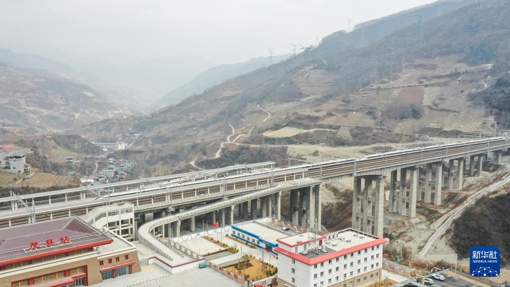 1月28日,一列動車組駛出川青鐵路茂縣站(無人機(jī)照片)。新華社記者 王曦 攝