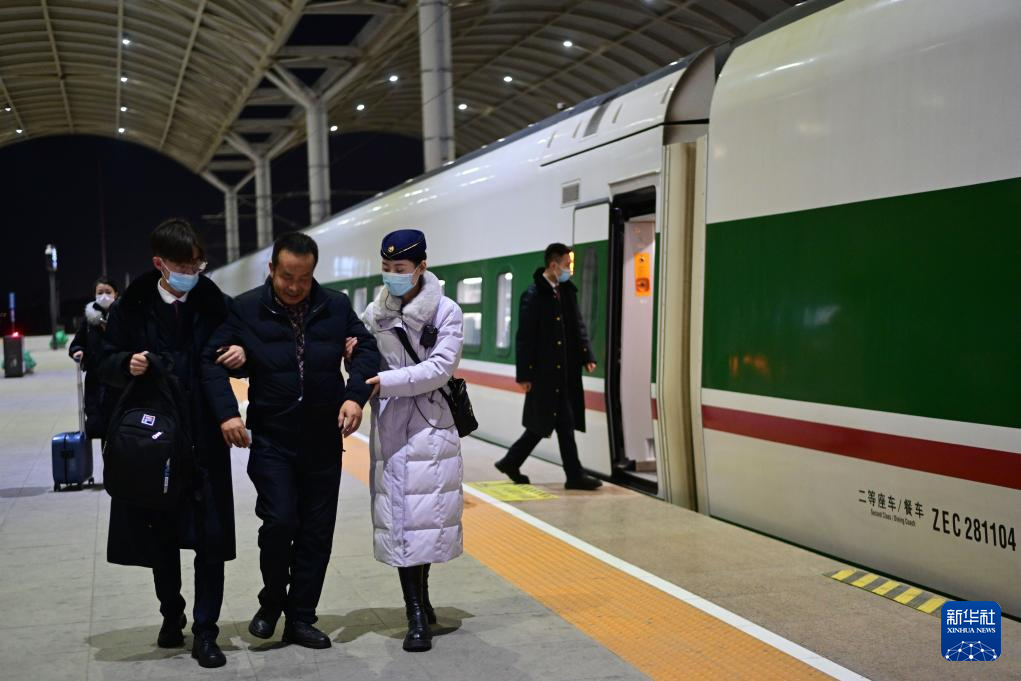 1月30日,中國(guó)鐵路青藏集團(tuán)有限公司西寧客運(yùn)段動(dòng)車隊(duì)西格八組乘務(wù)員陳麗琴在協(xié)助重點(diǎn)旅客下車。新華社記者 張龍 攝