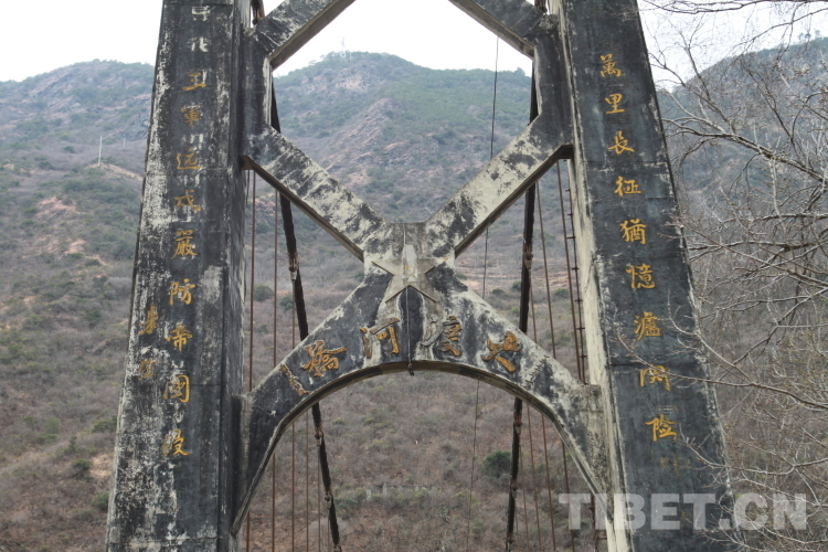 據(jù)了解,大渡河橋東西橋頭塔高分別為16米,孔徑132米,橋面4.5米,由27根直徑約3厘米大小的綱繩分布于左右兩側(cè),中間分別由45根同樣大小的鋼纜吊桿將橋身懸吊在大渡河上,橋身由無數(shù)鋼架鉚焊而成,鋼架之上鋪有約0.5米見方的方橙枕木,上鋪“人”字型拼木,允許載重量15噸。東西橋頭分別建有堅(jiān)固的崗?fù)ぃ鳂蝾^正面豎有三道屏墻,左為原中國人民解放軍第十八軍軍長張國華,政委譚冠三撰寫的碑文,中間書有毛澤東同志七律《長征》詩手跡,右為建橋工程說明。