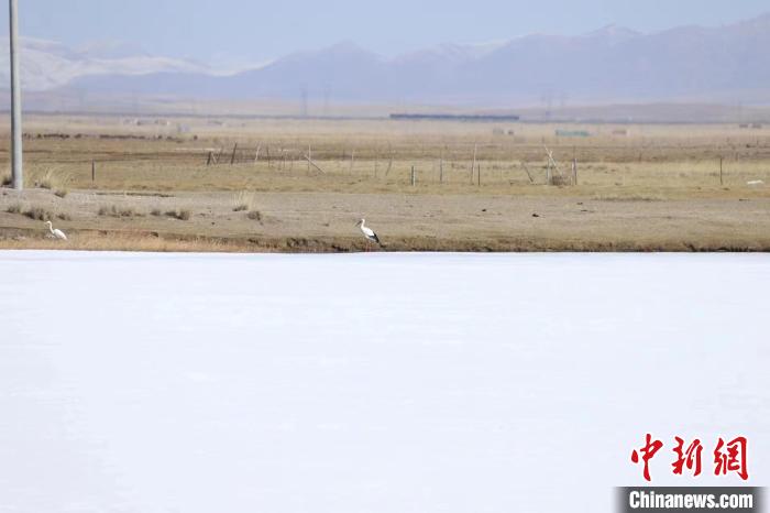 3月27日,東方白鸛在青海湖畔。(青海湖國家級自然保護(hù)區(qū)管理局供圖)
