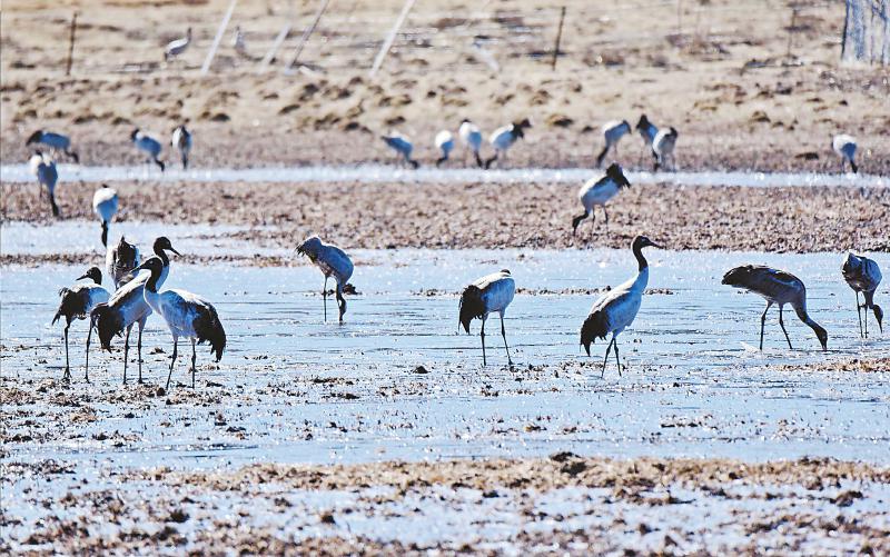 2014年11月11日,濕地中起飛的10多只黑頸鶴。謝宏程 攝