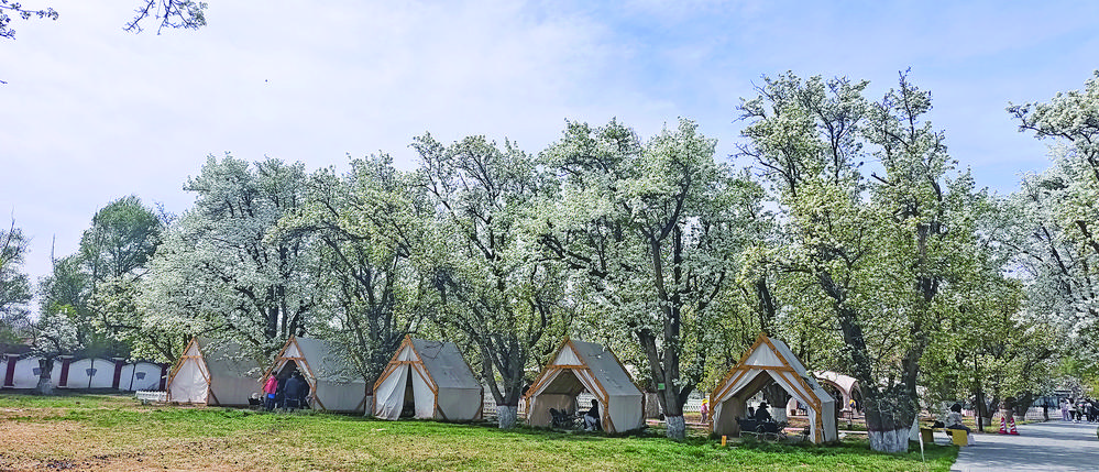 游客在梨樹(shù)下打卡拍照。洪玉杰 攝