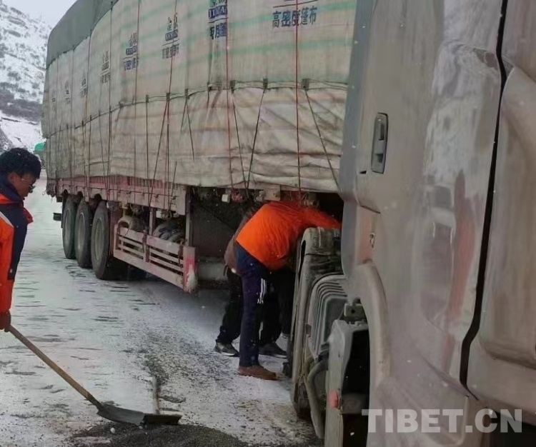 圖為公路養(yǎng)護(hù)者為打滑車輛拋灑防滑沙并上防滑鏈 供圖:澤旺卓瑪