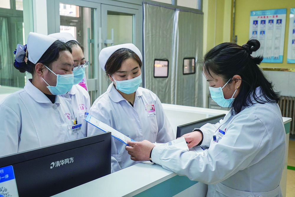 黃長(zhǎng)珠(右一)與護(hù)士討論巡診情況。張得俊 攝