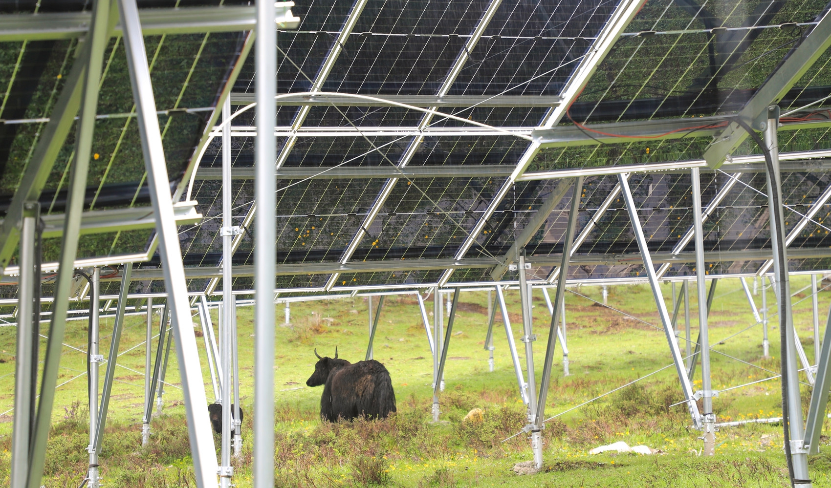 為打消顧慮,項目方探索起“牧光互補”模式,即建設的光伏板不低于地面1.8米,最高處是2.2米,能實現(xiàn)在光伏板上發(fā)電,板下放牦牛,做到“一草兩用,發(fā)展共贏”。同時,項目方還提前一年在基地建了一塊分布式光伏發(fā)電“試驗地”進行驗證。