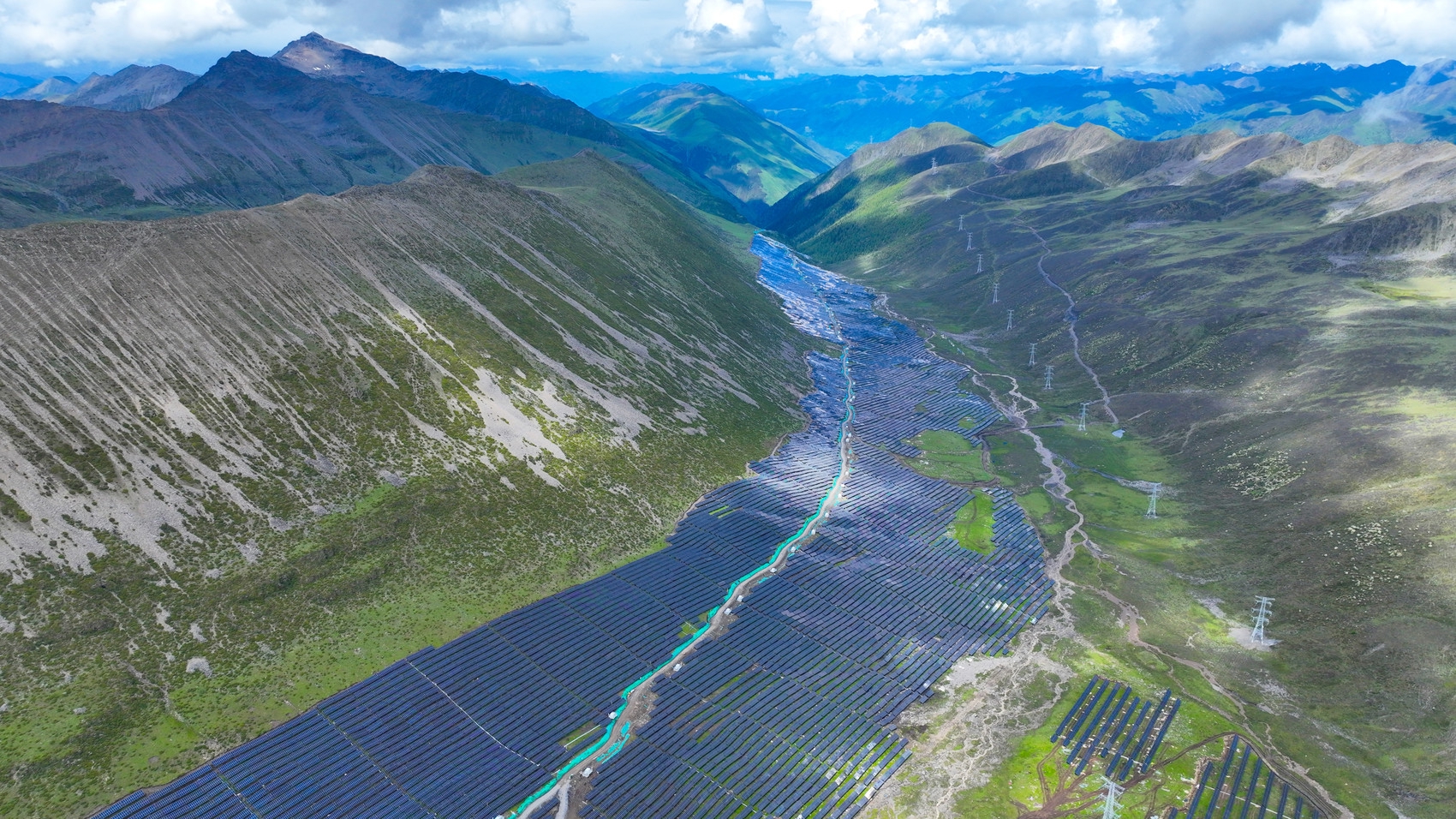 6月20日,海拔4200多米的高山遠牧點,一群群牦牛悠閑地吃著嫩綠的青草,不時發(fā)出“哞哞”的叫聲。五六米之外,就是一排排藍色太陽能光伏板整齊排列,幾十個工人穿梭其中忙著巡檢。