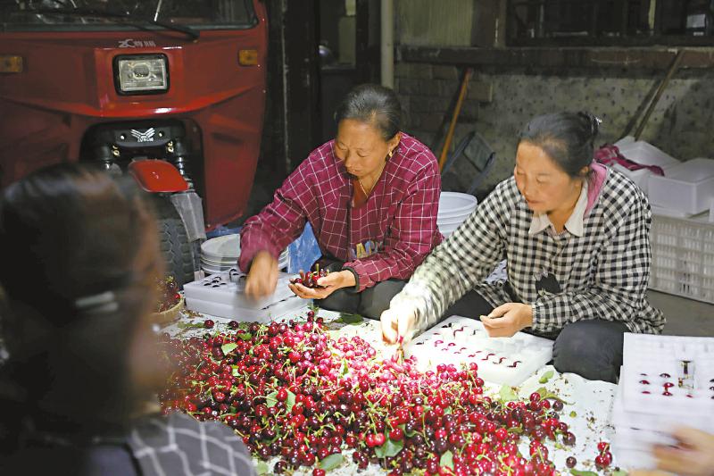 理縣村民分裝車厘子,準備裝箱送往機場?! ?/p>