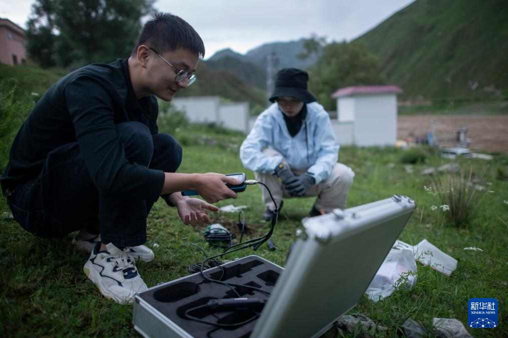 7月20日,在直門(mén)達(dá)水文站,長(zhǎng)江科學(xué)院空間信息技術(shù)應(yīng)用研究所廖茂昕(左)和付珺琳進(jìn)行土壤多參數(shù)檢測(cè)。新華社記者 伍志尊 攝