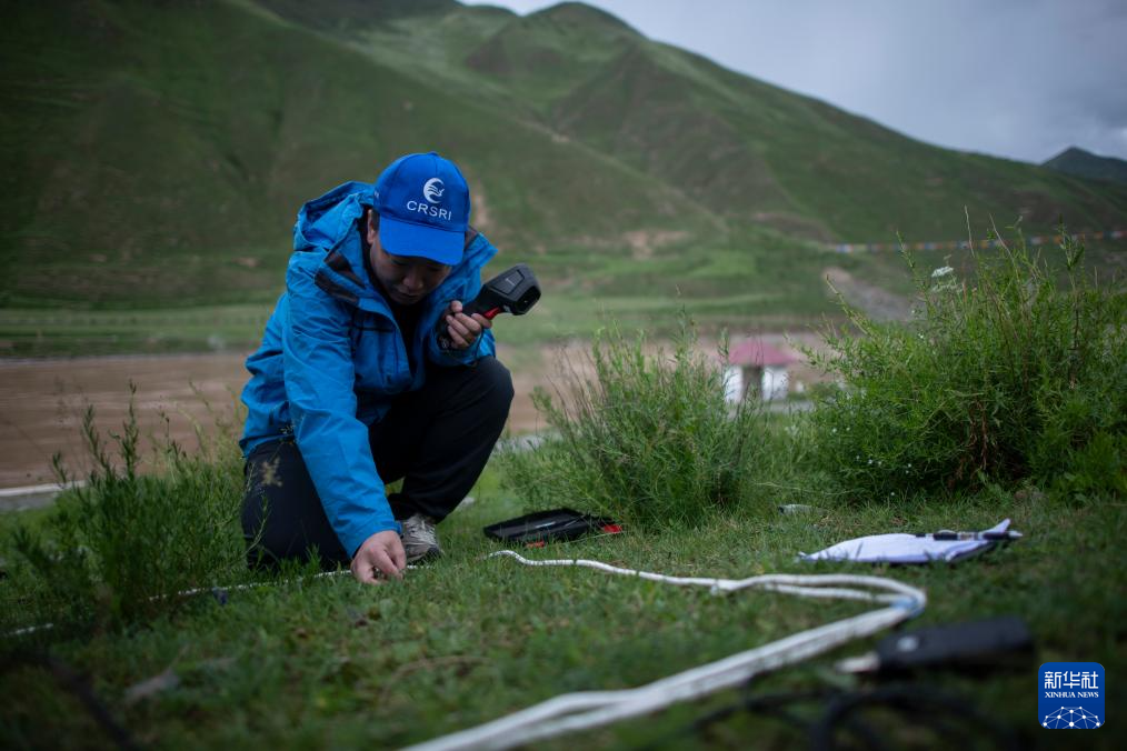 7月20日,在直門(mén)達(dá)水文站,長(zhǎng)江科學(xué)院水土保持研究所任斐鵬在進(jìn)行植被生態(tài)和水土流失調(diào)查。新華社記者 伍志尊 攝