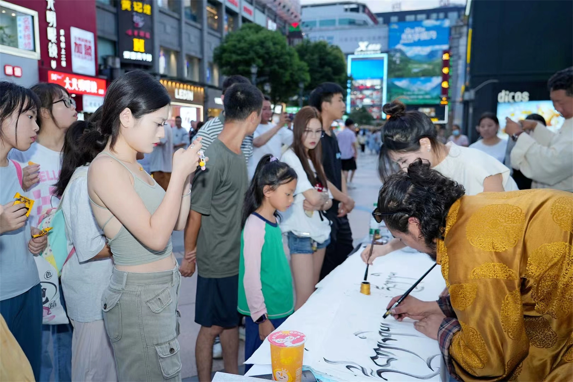 臨近傍晚,在春熙路“丹青繪盛景 筆墨頌祖國”藏文書法展演區(qū),兩位身著藏族傳統(tǒng)服飾的書法老師端坐于案幾之后,他們手持毛筆,蘸取特制的藏墨,在潔白的宣紙上揮灑自如,一筆一劃間流露出濃厚的藏族文化韻味。他們書寫的藏文內(nèi)容多為吉祥如意的祝福語,每一幅作品都蘊(yùn)含著對美好生活的向往和對遠(yuǎn)方來客的誠摯歡迎。